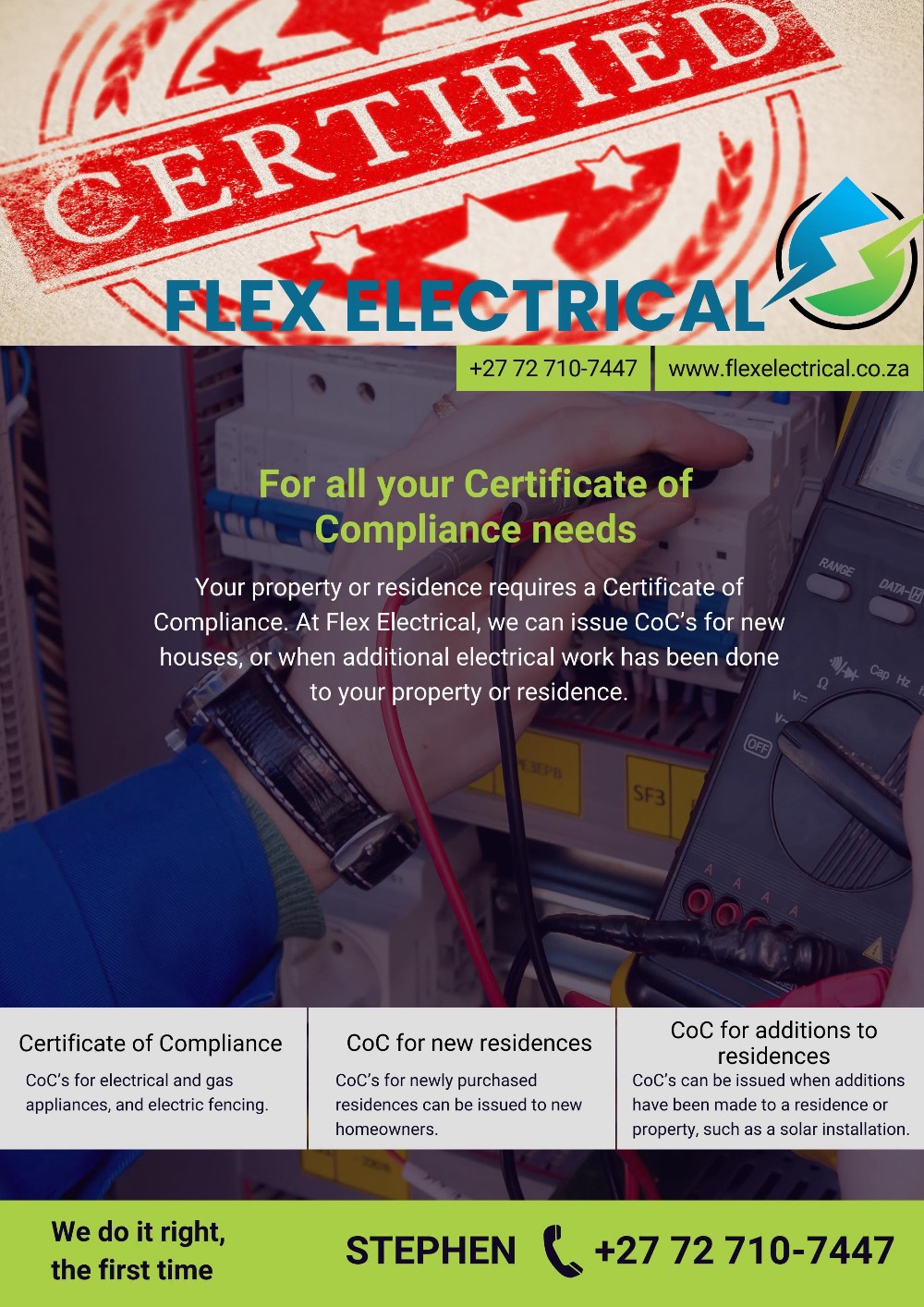 • Yes. We often issue compliance certificates should owners wish to sell their property. We inspect the current installation, request changes or fixes, and then issue a certificate once we are satisfied that all requirements have been met. Typical areas that require a CoC are the following: electrical; gas (stoves, fireplaces, and geysers); and electric fencing. All solar installations are accompanied by a CoC.